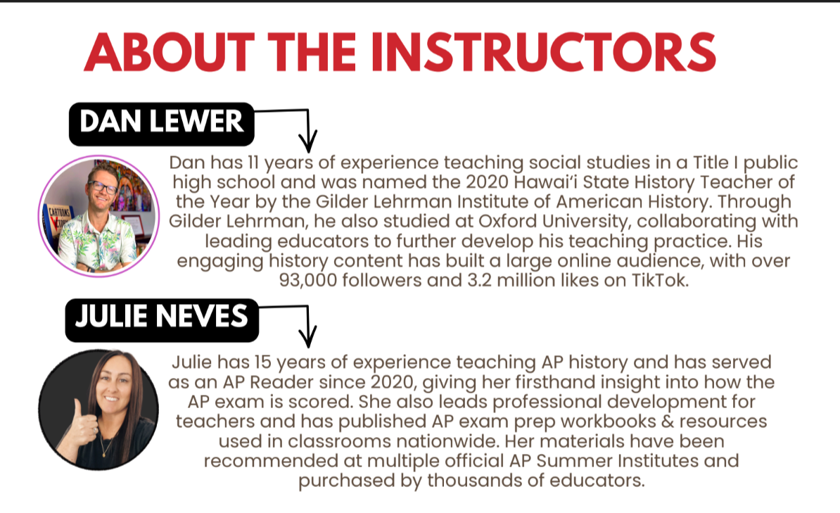 - Organized and led by two veteran APUSH teachers and readers, Dan Lewer & Julie Neves.